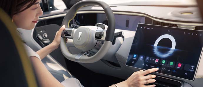 Centralny ekran sterowania o przekątnej 15,6 cala obsługuje funkcję podzielonego ekranu i wyświetla nawigację,aplikacje,ustawienia,kamery gry i filmy. Umożliwia przesyłanie okien na ekran pasażera i rozpoznaje polecenia głosowe.Panel główny wskaźników kierowcy to LCD o przekątnej 10,25 cala.